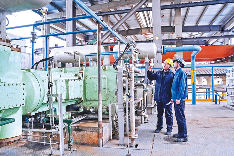 ◀平煤尼龙科技公司醇酮车间围绕“决战四季度、打赢收官战”总体目标,将保障生产系统长周期稳定运行作为首要任务。该车间技术骨干主动增加巡检频次、细化巡检内容,对关键设备和重点区域进行拉网式排查,以保障装置安全平稳运行。图为日前,该车间环己醇装置技术人员正在检查氢气压缩机安全附件。