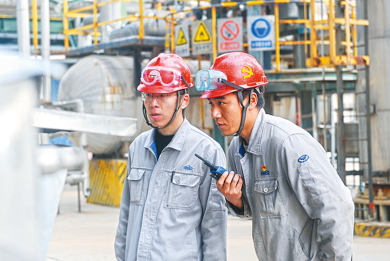 濮阳园区深入推进党建与安全生产、提质增效等工作深度融合,引导基层党员立足本职岗位,充分发挥党员先锋模范作用,保障装置安全稳定运行。图为3月31日,该园区基层党员带头在生产现场排查装置运行状况。